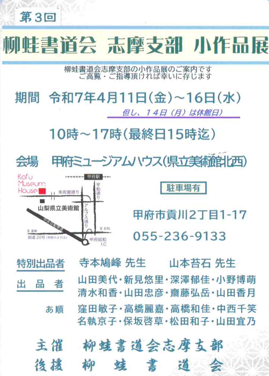 Topics 2025.4.11(金)~4.16(水)第3回 柳蛙書道教室 志摩支部 小作品展 開催のお知らせ